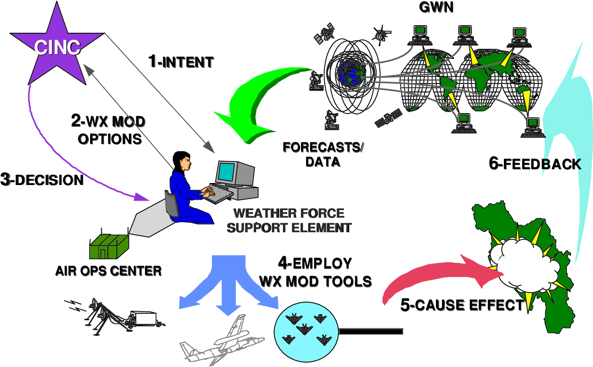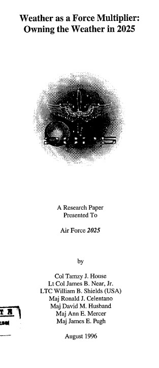 වර්තමාන ජනාධිපති ඩොනල්ඩ් ට්රම්ප් යටතේ එක්සත් ජනපද යුද දෙපාර්තුමේන්තුව ලෙස නැවැත නම් කරන ලද එක්සත් ජනපද ආරක්ෂක දෙපාර්තුමේන්තුව 1997 දී, “ කාලගුණය බලය බහුගුණනය කිරීමේ අවියක් ලෙස: 2025 දී කාලගුණය අත්පත් කරගැනීම”(Weather as a Force Multiplier: Owning the Weather in 2025) නමින් කෘත්රිම කාලගුණික විපර්යාසකරණය සහ ඒ හා සම්බන්ධ යුද තාක්ෂණය සංවර්ධනය පිළිබඳ සවිස්තරාත්මක විශ්ලේෂණයක් සහිත වාර්තාවක් නිකුත් කරන ලදි. මේ මගින් 1996 සිට කරමින් පවතින කාලගුණික අවි සංවර්ධනය සහ 2025දී ඒවා භාවිතයට ගැනෙන ආකාරයේ සීනාරියෝ සැලසුමක්ද ඉදිරිපත් කර තිබිණි.